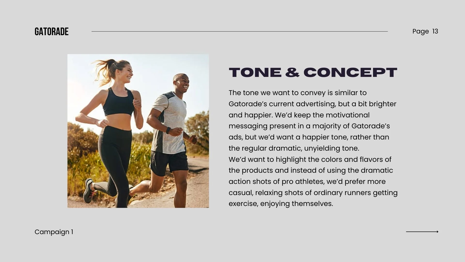 My group chose Gatorade as its brand. Our goal was to appeal to hobbyist runners. This would mean creating a campaign for a relatively older age group than Gatorade’s main target audience.